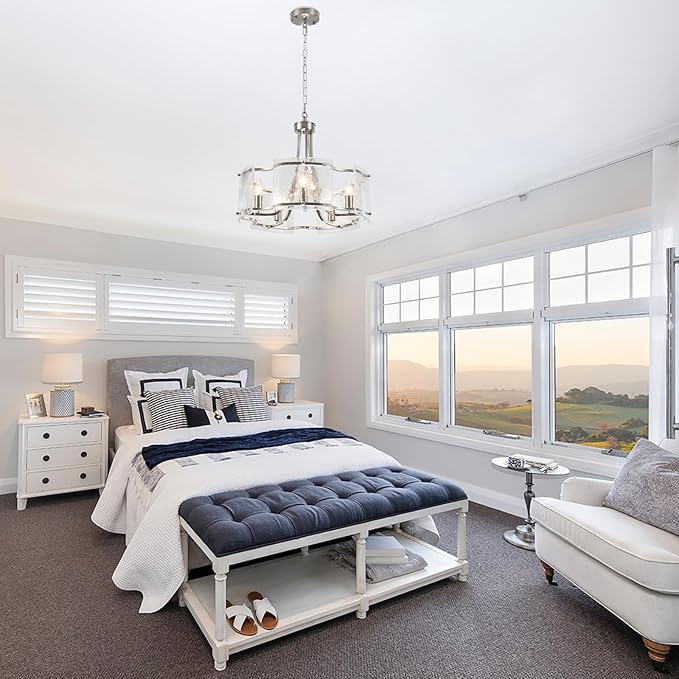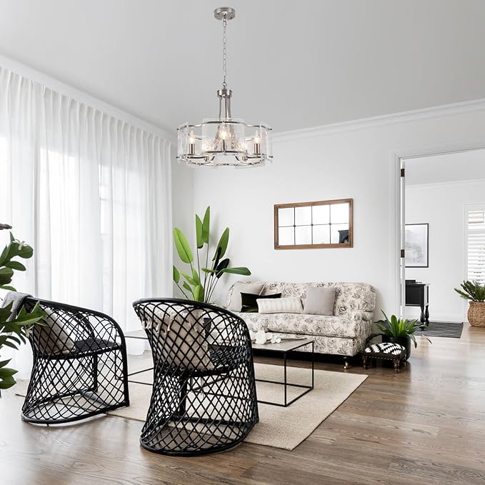 - Modern Glass Chandelier: The nickel crystal chandeliers features clear glass elements with a brushed nickel frame to create an elegant drum crystal chandelier. Textured water glass will create a unique light and shadow effect when the light penetrates, casting a very beautiful light, creating an elegant romantic atmosphere for your home, making it the focal point of home decoration.