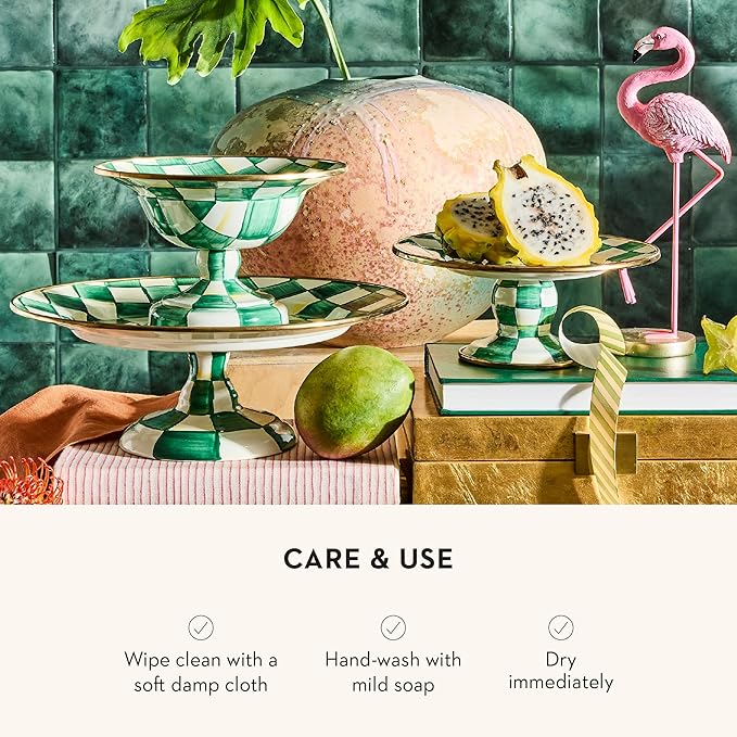 - SERVING ESSENTIAL: A cake or cupcake stand doesn’t get any more classic than this. This serving dish features a hand-glazed heavy-gauge steel underbody, a bronzed stainless-steel rim, and our enchanting green-and-white Emerald Check pattern.