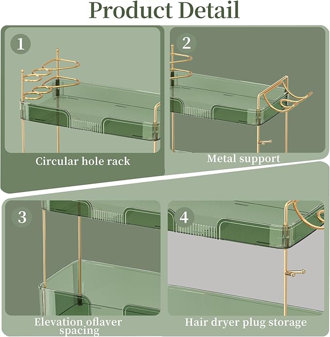3 Tier Bathroom Organizer Countertop Makeup Perfume Skincare Organizer Comes with Hair Dryer Rack and Toothbrush Holder for Bathroom Dresser Vanity (Green)