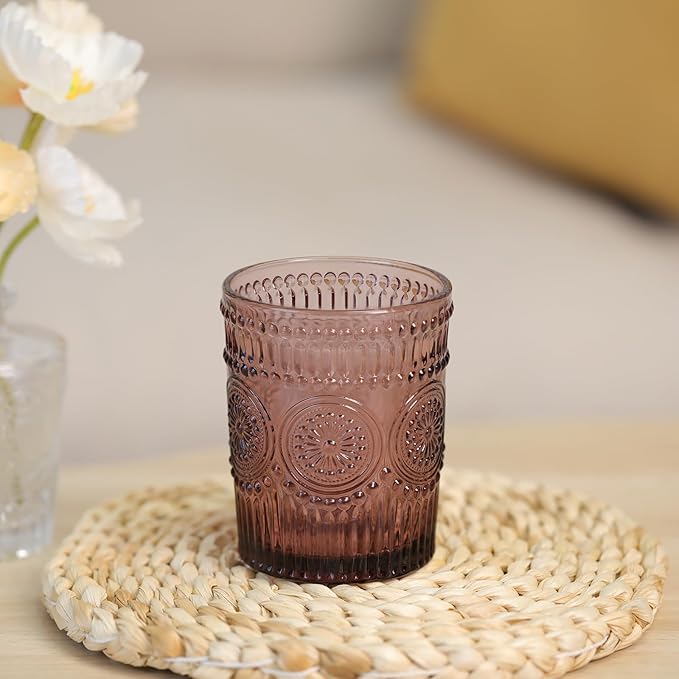 Vintage Glassware Drinking Glasses Set of 4-10.5 oz Purple Glasses Water Tumbler, Embossed Glassware Cups for Juice, Beer, Cocktail, Whiskey, Various Mixed Drinks