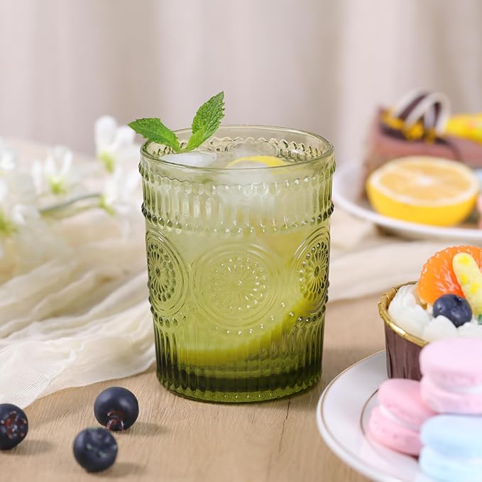 - 🥂[ Package Includes ]-- You will get green vintage glassware set of 4, measures 3.11" diameter, 3.94" high and 10.5 oz capacity. There are enough quantities for daily use, can be added to any place in the kitchen, and will also satisfy your collection of glassware.