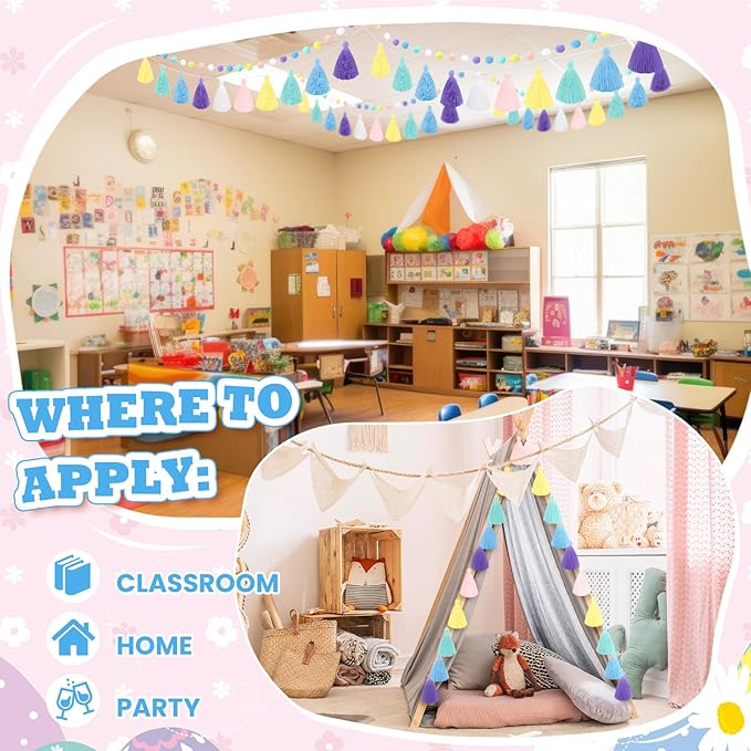 - You Will Receive: the package comes with 2 pieces of pastel tassel garland and 2 pieces of pom pom ball banners, enough ornaments for you to decorate your room to be warm and beautiful to enhance festival atmosphere