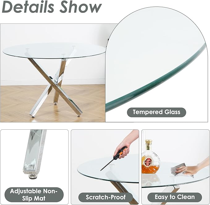 - [Modern Dinner Table Set with Non-slip Foot Mads] This mid century glass dinette set includes 1 table and 4 chairs, and it is charming and suitable for all home styles. Plus, we always insist on high quality products. The plated metal frame matches the non-slip feet we use, which are durable and sturdy, so it must be an ideal furniture choice.