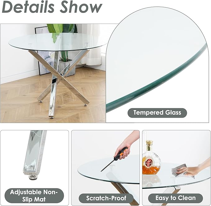 - [Modern Dinner Table Set with Non-slip Foot Mads] This mid century glass dinette set includes 1 table and 4 chairs, and it is charming and suitable for all home styles. Plus, we always insist on high quality products. The plated metal frame matches the non-slip feet we use, which are durable and sturdy, so it must be an ideal furniture choice.