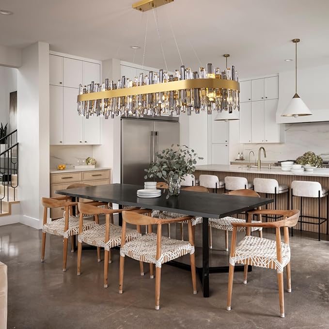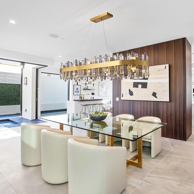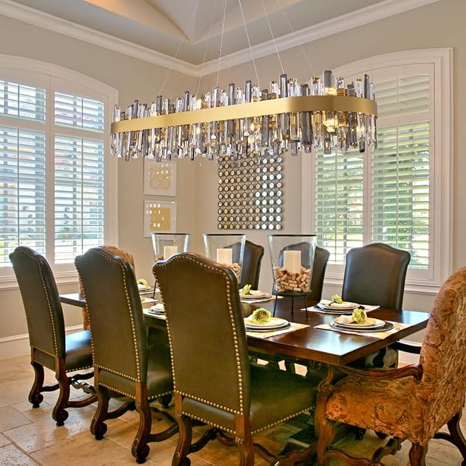 - â¨ăModern Crystal Chandelieră: With the large size brushed gold lamp body and elegant clear & gray raindrop lampshade, this luxury crystal chandelier is a centerpiece that can transform your home ambiance and enhance the decor of any rooms. Suitable for dining room, living room, kitchen island, bar, entryway, hallway, foyer, closet, etc.