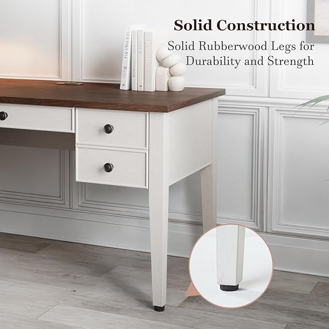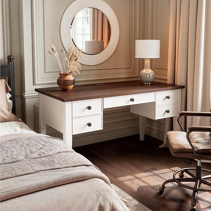 - Farmhouse Desk– Combining modern farmhouse charm with country simplicity.Birch solid wood texture desktop combined with white distressing process and bronze handles to create a retro and elegant visual effect.
