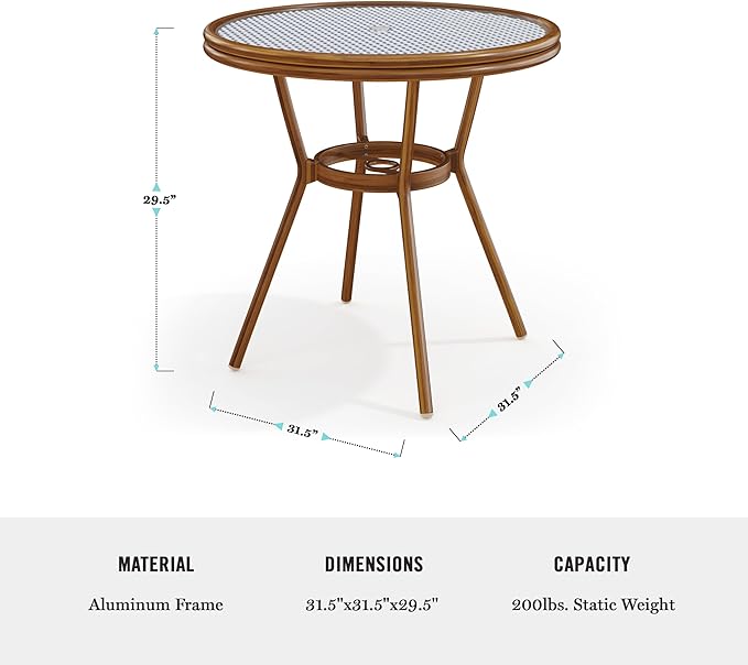Martha Stewart Lily Pond 31” Round Indoor-Outdoor Bistro Dining Table with Aluminum Frame in Natural Woodgrain and Rattan Top in White/Navy with Tempered Glass Top