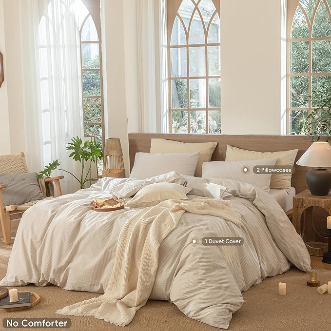 - Great Texture & Comfort: Looks like linen, feels like cotton, with a lived-in, slightly wrinkled look, which offers that feeling of staying at a nice resort where the duvet covet sets are always crisp, clean and comfortable. The relaxing look of this tannish linen grey white pinstripes bedding set and the cool texture make it hard to get out of bed.