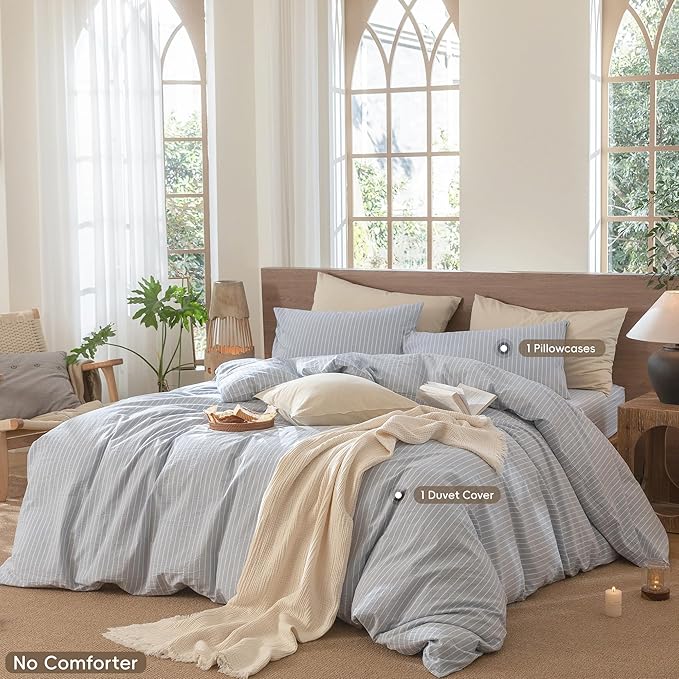 - Great Texture & Comfort: Looks like linen, feels like cotton, with a lived-in, slightly wrinkled look, which offers that feeling of staying at a nice resort where the duvet covet sets are always crisp, clean and comfortable. The relaxing look of this cornflower blue white wide stripes bedding set and the cool texture make it hard to get out of bed.