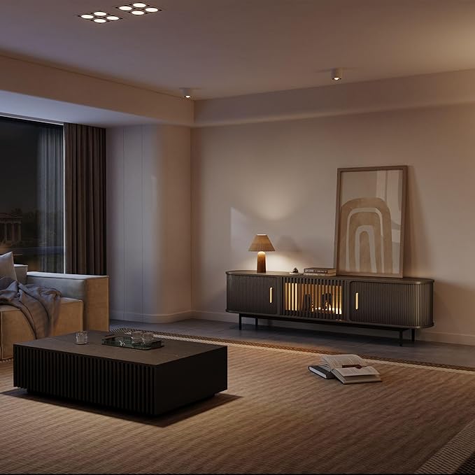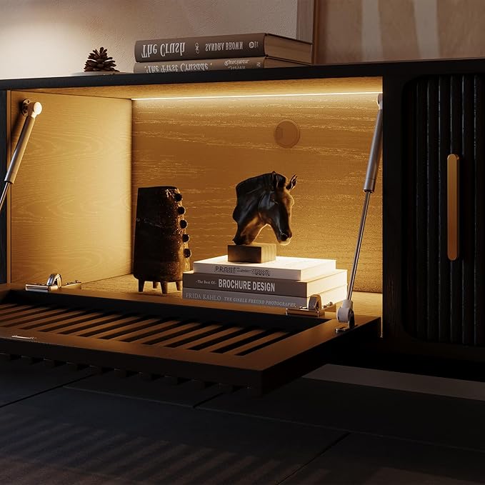 - Sliding Door TV stand: This mid century modern tv stand with slatted roll-up door design, easy-glide sliding track, smoothly glides to any position along the tv console table, it is elegant and prevents dust from entering the TV cabinet