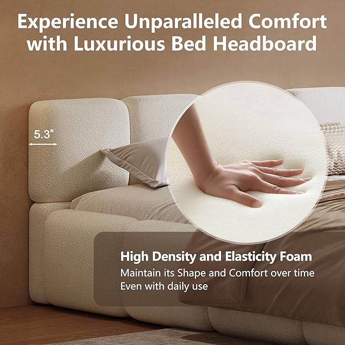 - 【Versatile Queen Headboard and Bed】Whether your decor is modern, minimalist, or eclectic, this bed’s timeless design and neutral boucle fabric seamlessly blend with any interior style, making it a versatile centerpiece for your bedroom
