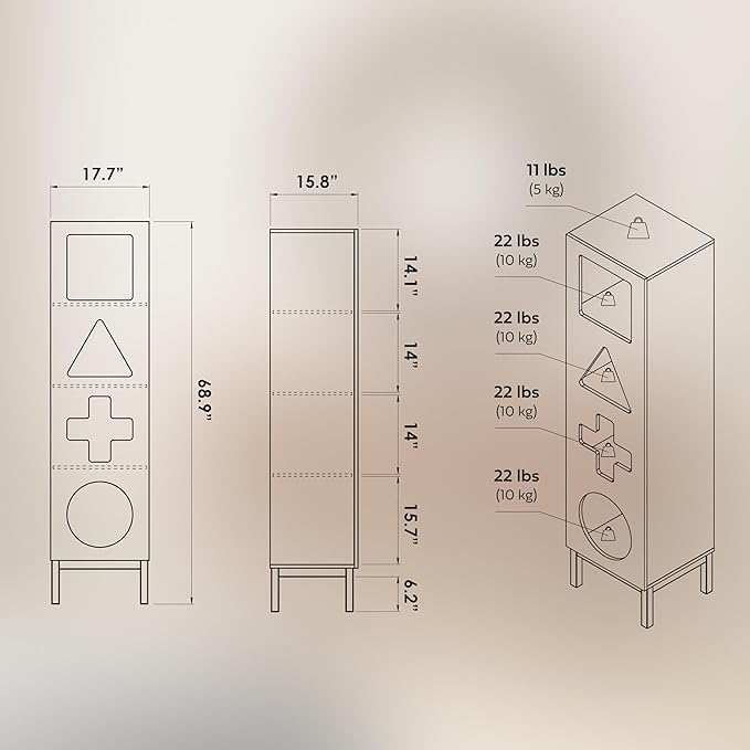 - CREATE PLAYFUL STORAGE FOR KIDS with a wooden display cabinet that makes tidying up fun. Geometric cut-outs add a playful touch, while spacious compartments keep toys and games organized with ease, and medals and trophies proudly shown. The space behind the round cut-out in the door is perfect for creating a cozy pet hideaway for cats or small dogs when a blanket or pillow is added (not included).