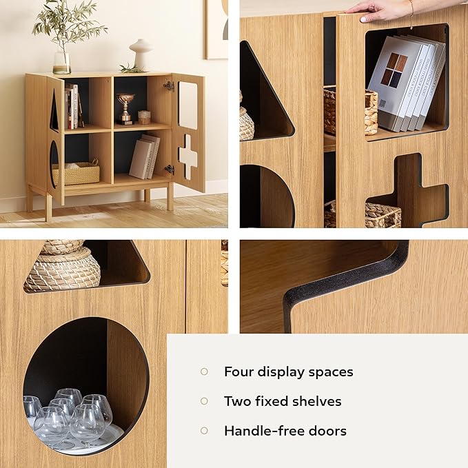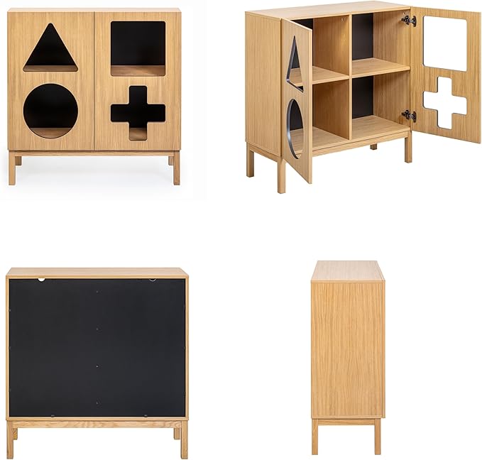 - CREATE PLAYFUL STORAGE FOR KIDS with a wooden display cabinet that makes tidying up fun. Geometric cut-outs add a playful touch, while spacious compartments keep toys and games organized with ease, and medals and trophies proudly shown. The space behind the round cut-out in the door is perfect for creating a cozy pet hideaway for cats or small dogs when a blanket or pillow is added (not included).