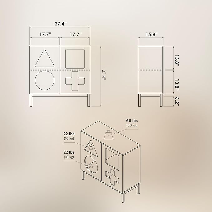- SHOWCASE YOUR FAVORITES IN STYLE as the four geometric cut-outs in the door turn your collectibles, awards, and decorative accessories into a design feature that adds character to your space. The wide display cabinet (width 37.4’’ x depth 15.8'' x height 37.4’’) features two fixed height shelves that create four storage spaces which are perfect for display-worthy items and for organizing books, baskets, and everyday essentials.