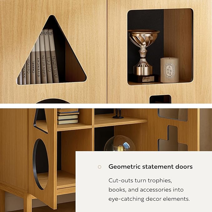WERMO 37'' Showcase Display Cabinet with Geometric Cut-Out Doors - Modern Curio Cabinet for Dining Room, Living Room, Entryway. Trophy Case and Collectible Display Case Wood with Door & Storage Consoles (Oak)