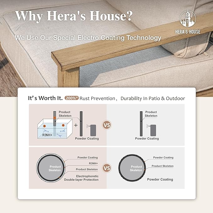 - 【E-Coating & Powder-Coating Technology】All the HERA'S HOUSE metal frame of patio furniture sets are processed by high-performance E-COATING and POWDER-COATING technique which provides extended protection against rust, scratches, rain, and UV harm. All weather resistant, anti-rust, easy to clean, no special care needed