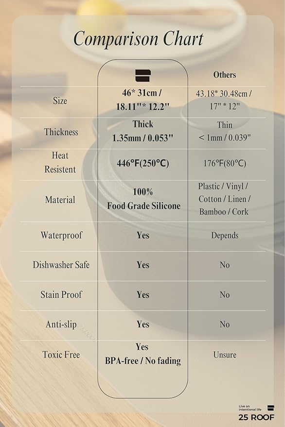 - Heat Resistant & BPA-Free - Made from 100% food-grade silicone, BPA-free, non-toxic, and odourless. Withstands heat up to 446°F (230°C) to protect your table from hot plates, scratches, and spills.