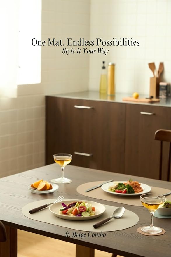 Beige Oval Silicone Placemats Set of 6 – Heat Resistant, Waterproof, Easy to Clean Non-Slip Modern Dining Table Mats – Premium Leather Textured Japandi Kitchen Decor
