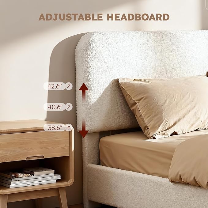 Full Size Cloud Bed Frame, Upholstered Boucle Bed Frame with Adjustable Headboard, Solid Wood Legs, Rounded Corners Design & Easy Assembly – Modern Platform Bed,Cream