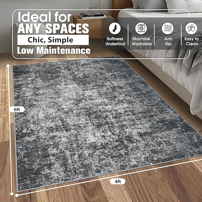 4x6 Area Rugs for Living Room Rug Washable: Abstract Rug for Dining Room Bedroom Carpet Non Slip 4 by 6 Indoor Modern Nursery Home Office Black Grey
