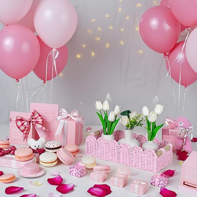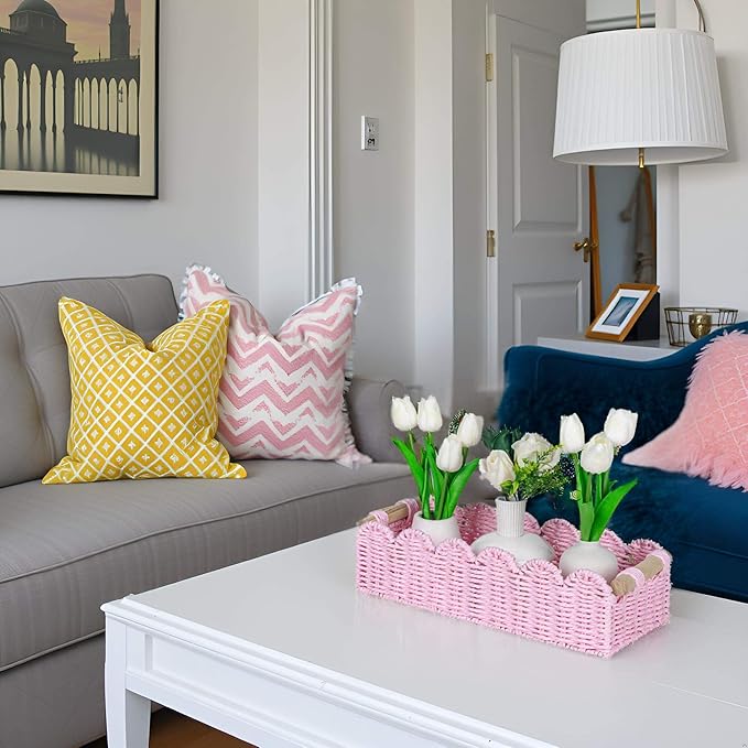 CubesLand Paper Rope Scalloped Edge Gift Basket Empty, Small Living Room,Bedroom Decor Baskets, Pink Woven Toilet Paper Storage Basket, with 2 Wooden Handle, Rectangular