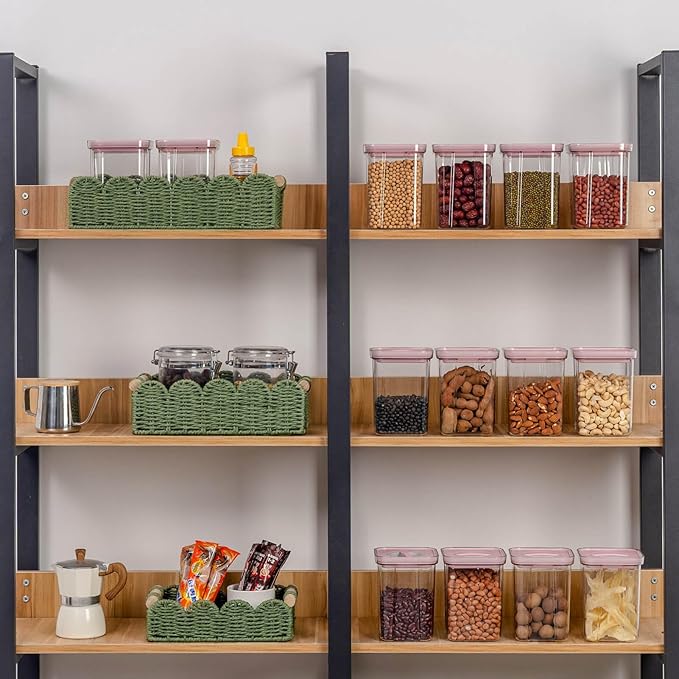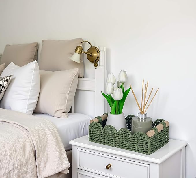 - MULTIPURPOSE USE: Our scalloped edge paper rope decor basket add personality and charming addition to bedroom, living room, bathroom, nursery and space-floating shelves, over toilet storage shelf, end table, nightstand,storage cabinet, bookcase and more, also serve well to small items, beauty products, cleaning supplies, and more