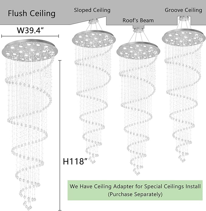 - Spiral Raindrop Glam Chandelier - Whole length is 118". Canopy W39.3" x H2". Weight 72.7 lbs (about 33kg). Thickened finished stainless steel ceiling base plus K9 crystal. Chandelier height is not adjustable, please confirm the size before purchase.