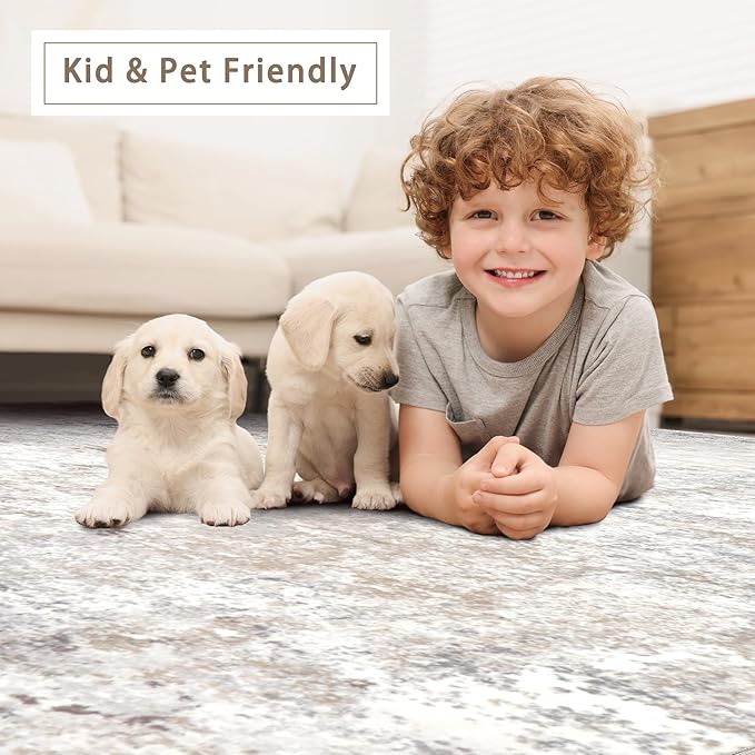 Modern Washable Rugs 9x12 Area Rugs for Living Room,Abstract Rugs for Bedroom,Large Carpets,Ultra Soft Faux Wool Retro Dining Room Rug,Non Slip&Non-Shedding Low Pile Print Rug- Beige Grey