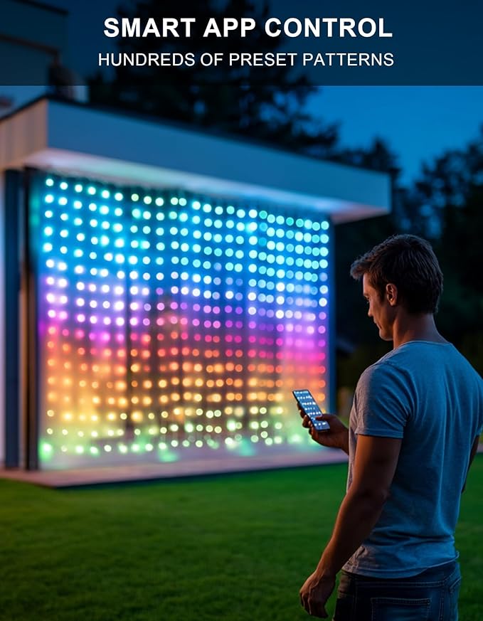 - Reliable and Safe: Our low-voltage, IP44 waterproof curtain lights are perfect for both indoor and outdoor use, even on rainy days. Ideal for decorating homes, parties, bedrooms, windows, patios, gardens, Christmas trees, bars, and music festivals. Whether you're decorating for a holiday, setting the mood for a special event, or adding a touch of magic to your space, our smart curtain lights will create unforgettable visuals with ease