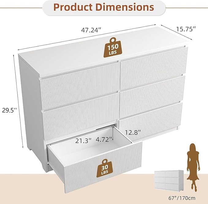 - 【Fluted Dresser for Bedroom】 the chest of drawers for bedroom completes with 6 big drawers,which can store your clothes, toys, books, or any other personal items,making it easier for you to sort and store clutter! spacious tabletop is perfect to place frequently used items, keeping them in your reach