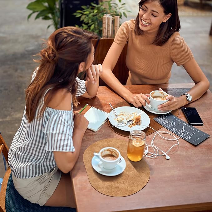 ADRIMER Placemats, Heat Resistant Oval Placemats Set of 4 Washable 12 x 17 Inch, Waterproof Table Mats, Wipeable Pu Place Mats for Kitchen, Dining Room, Turmeric Brown+Light Brown+Green+Blue