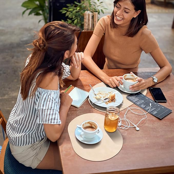 ADRIMER Placemats, Heat Resistant Oval Placemats Set of 12 Washable 12 x 17 Inch, Waterproof Table Mats, Wipeable Pu Place Mats for Kitchen, Dining Room, Beige