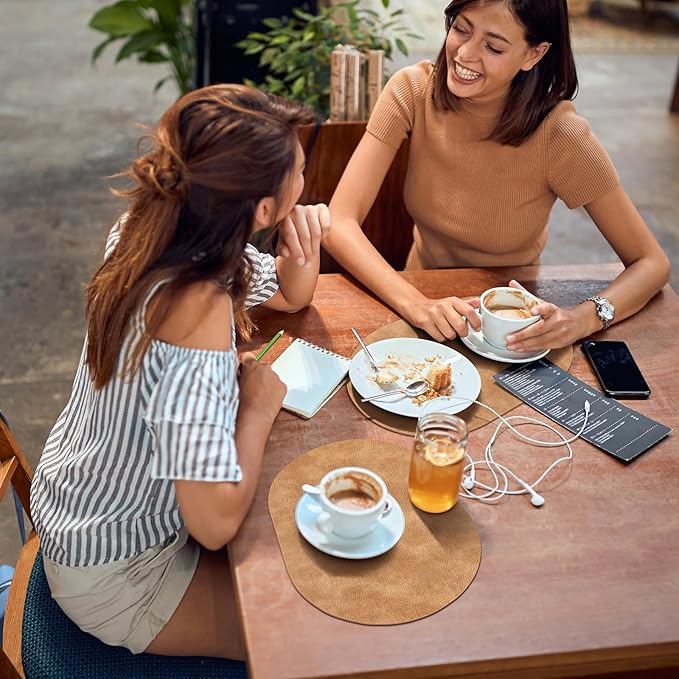 ADRIMER Placemats, Heat Resistant Oval Placemats Set of 8 Washable 12 x 17 Inch, Waterproof Table Mats, Wipeable Pu Place Mats for Kitchen, Dining Room, Light Brown