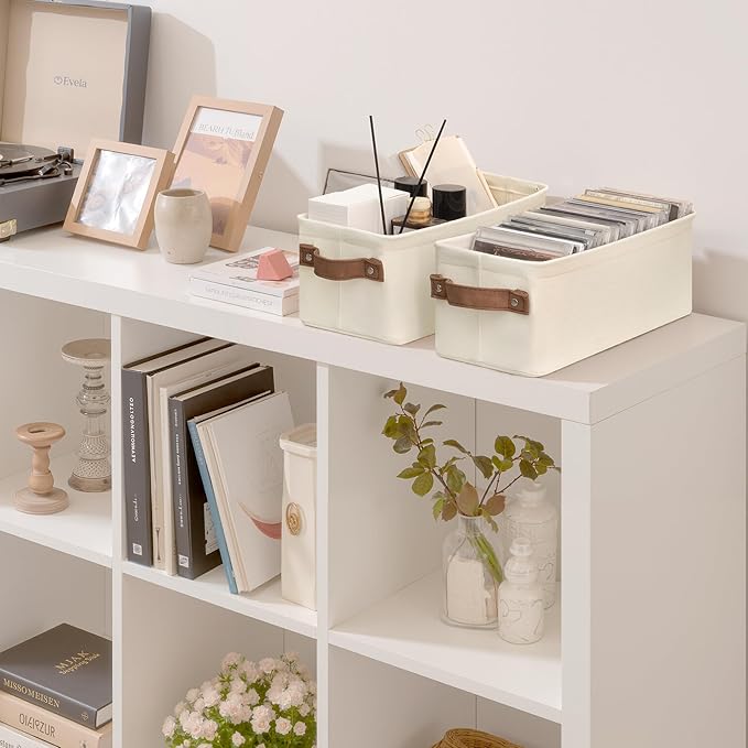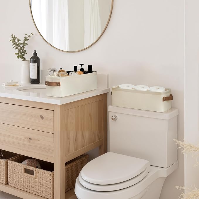 StorageWorks Narrow Storage Bins, Small Basket for Closet and Shelves, Fabric Organizer with Handles, Toilet Paper Storage, Natural Color, 2-Pack