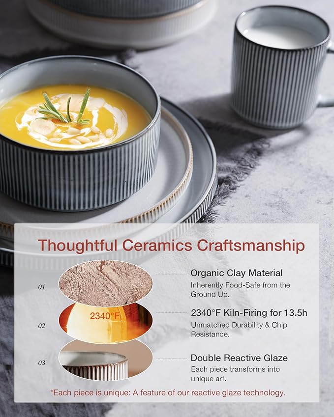 - [Everyday dinnerware]: Our premium stoneware dinnerware crafted from organic and natural clay, is LEAD-FREE and CADMIUM-FREE. It ensures safety for both your family and the environment. You can savor all kinds of meals, including steaks, salads, and desserts, with complete confidence
