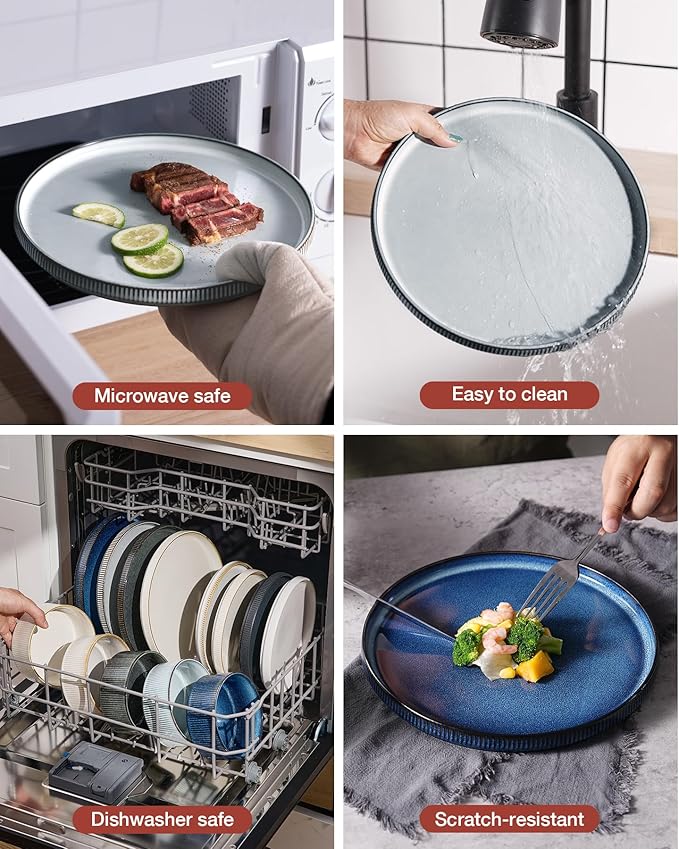 - [Everyday dinnerware]: Our premium stoneware dinnerware crafted from organic and natural clay, is LEAD-FREE and CADMIUM-FREE. It ensures safety for both your family and the environment. You can savor all kinds of meals, including steaks, salads, and desserts, with complete confidence