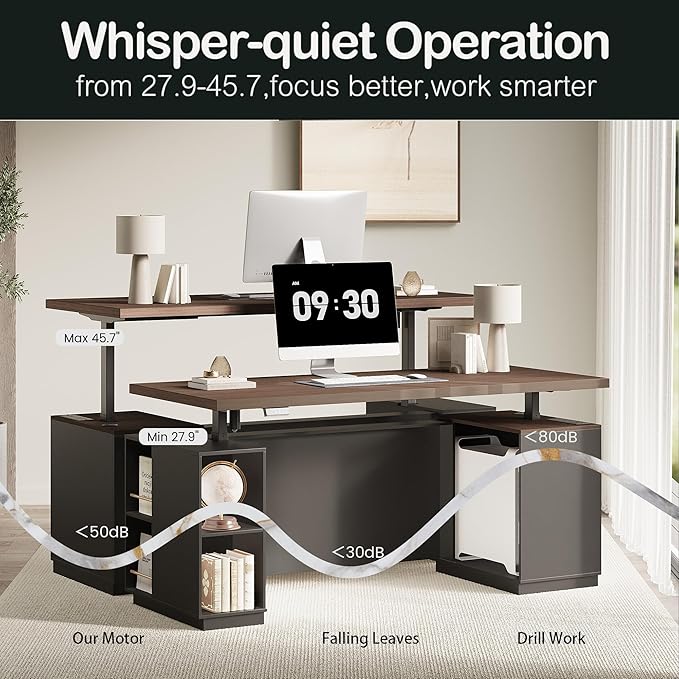 - Customize Your Height: This standing desk can be adjusted from 27.9“ to 45.7” (excluding desktop height). 2 memory buttons allow you to set any comfortable height as your usual office height and standing height. And the lifting process is quiet, the noise is below 50 db