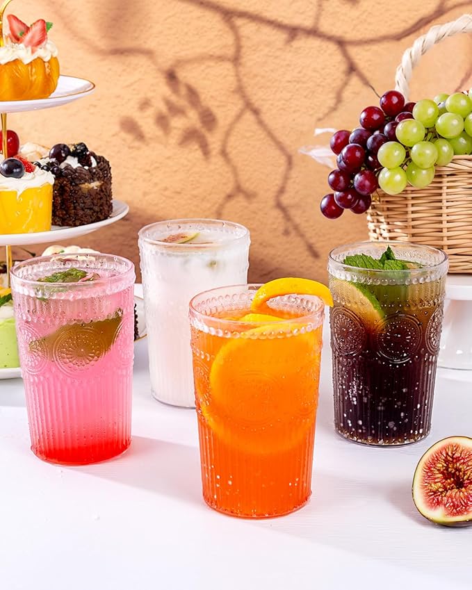- UNIQUE AND VINTAGE DESIGN: The retro flavor makes this romantic plastic water glasses beautiful and unique. Our vintage plastic drinking glasses are embossed designed with 12 plastic vintage glasses for your favorite juice and cocktail drinks. The plastic drinking glasses have been designed to fit any kind of tableware.