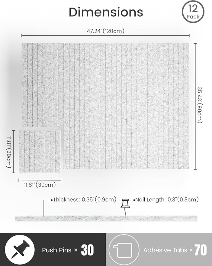 - 【Felt Bulletin Board – 12 Tiles Included】 Includes 12 felt cork boards (each 11.8" x 11.8") with 30 Pushpins that can be freely arranged into a large display board. Perfect for showcasing your schedules, ideas, and creations in home or office settings.