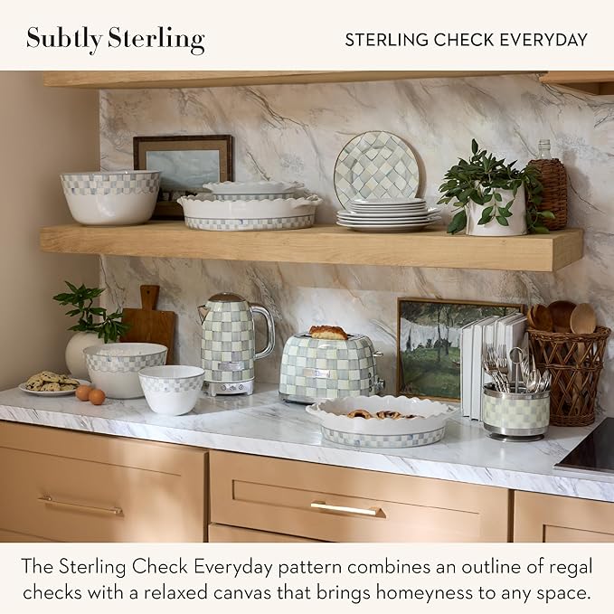 - ENTERTAINING ESSENTIAL: Elevate meals with the Sterling Check Everyday Oval Baker. It features a white stoneware base, ornate handles, and a scalloped rim decorated with subtle hand-painted gray-and-white checks.