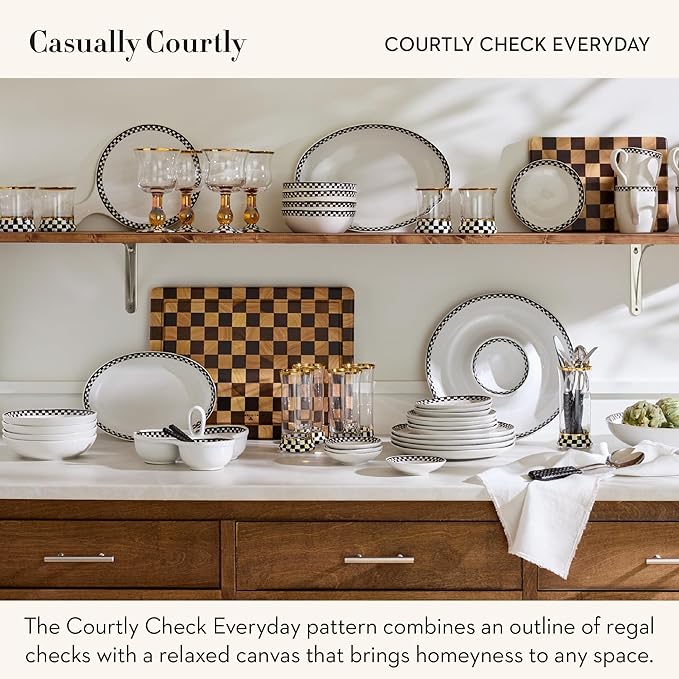 - ENTERTAINING ESSENTIAL: Elevate meals with the Courtly Check Everyday Oval Baker. It features a white stoneware base, ornate handles, and a scalloped rim decorated with hand-painted black-and-white checks.