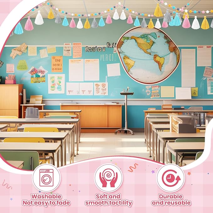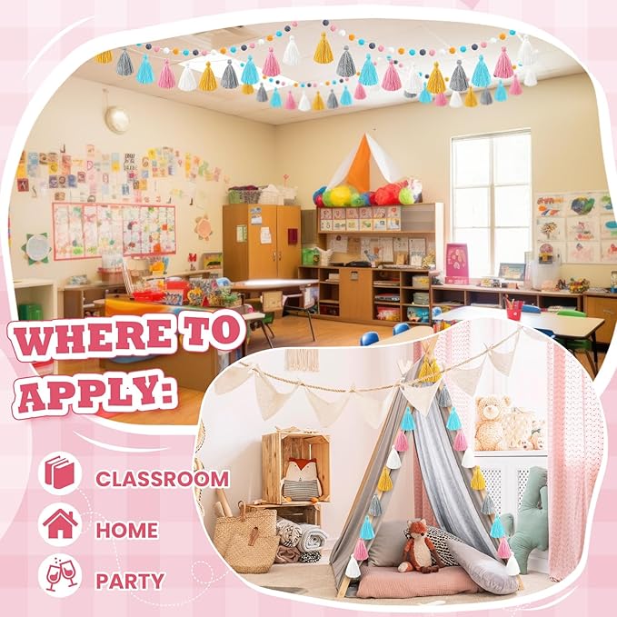 - Long enough: each garland measures approx. 47.1 inches in full length, each tassel height measures approx. 3.1 inches, pom ball garland is 90 inches in full length, each ball is 1 inch in diameter, the suitable size makes them look harmonious and beautiful