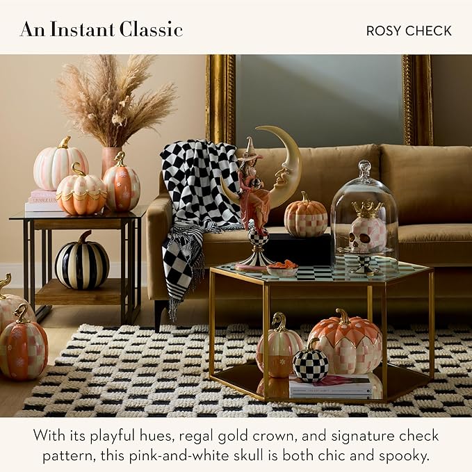 MACKENZIE-CHILDS Crowned Skull, Resin Halloween Home Decor, Pink-and-White Rosy Check