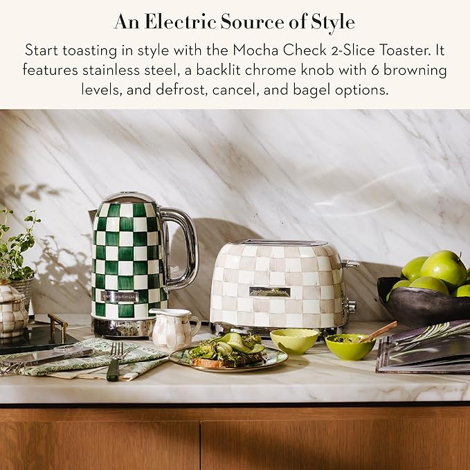 - ELEGANT KITCHEN DECOR: The Mocha Check stainless-steel 2-slice toaster is a fun take on a must-have electronic appliance. This cute toaster features our warm brown-and-white checkered pattern with color-dragged accents that mimic brushstrokes.