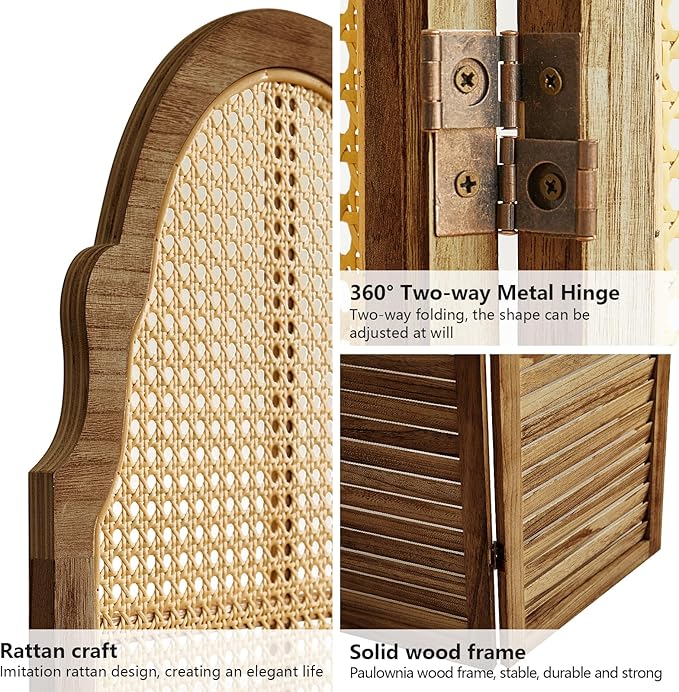 - Freestanding Folding Privacy Screen: Each panel of the Asnefeli rattan room divider is 15.7 inches wide, and each panel is connected by 2 two-way metal hinges. The room divider panel can be folded in any direction according to your preference, and the shape of the wooden privacy screen can be adjusted according to your needs. The room divider screen is easy to store and takes up only a small space when fully folded.