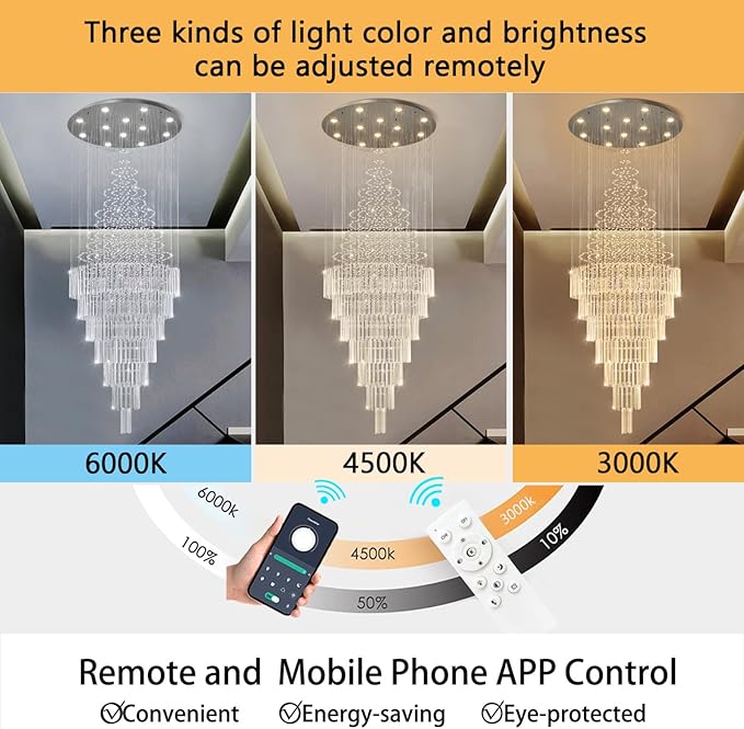 - Remote Dimmable Chandeliers - This chandelier comes with LED dimmable bulbs and remote control, you can control any lighting colors in the range of warm light 2700K- day light 6000K, and dimming brighhtness 5%-100% (This chandelier also comes with a dimmer, please do NOT use it with any dimmer switch or dimming system! )