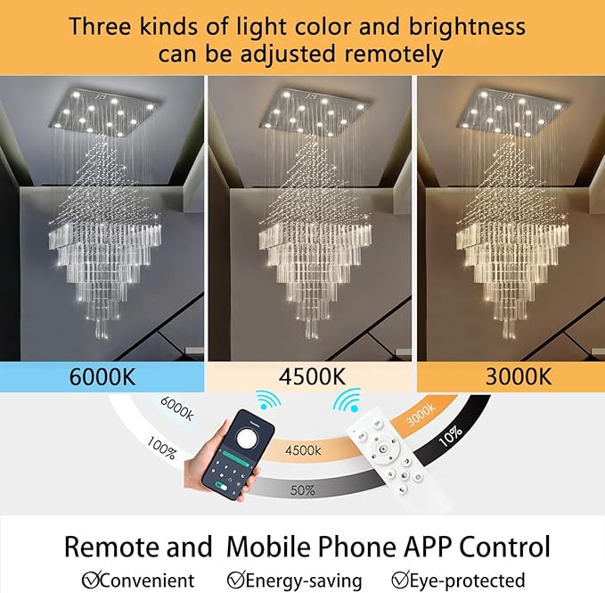 - Remote Dimmable Chandeliers - This chandelier comes with LED dimmable bulbs and remote control, you can control any lighting colors in the range of warm light 2700K- day light 6000K, and dimming brighhtness 5%-100% (This chandelier also comes with a dimmer, please do NOT use it with any dimmer switch or dimming system! )