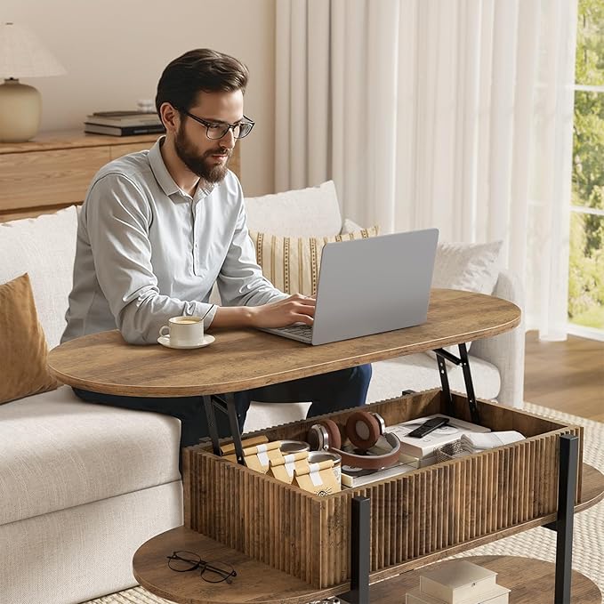 - Stable & Reliable Construction: Made from MDF wood materials, this fluted wood center table with round-edged lift tabletop offers a sturdy structure for smooth and steady lifting without shaking. Crafted with metal legs for stability and style, it offers strong support while adding a unique touch to your living room