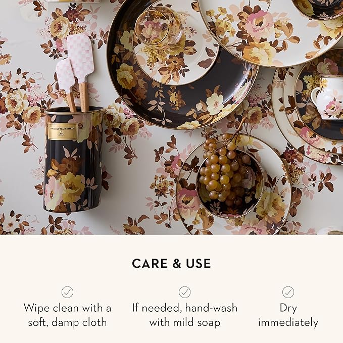 - ELEGANT STORAGE ESSENTIAL: Our Wild Rose Brown Utensil Holder charms with inviting fall colors and intricate floral transfers on a dark backdrop. The bronzed stainless-steel rim and metallic plate bring refined elements to your kitchen storage.