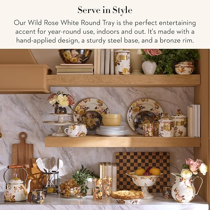 - ELEGANT SERVING ESSENTIAL: Serve food and drinks in style with the exquisite Wild Rose White round decorative tray. This circular tray features a hand-applied rustic rose floral design and a bronzed stainless-steel rim on a sturdy steel underbody.